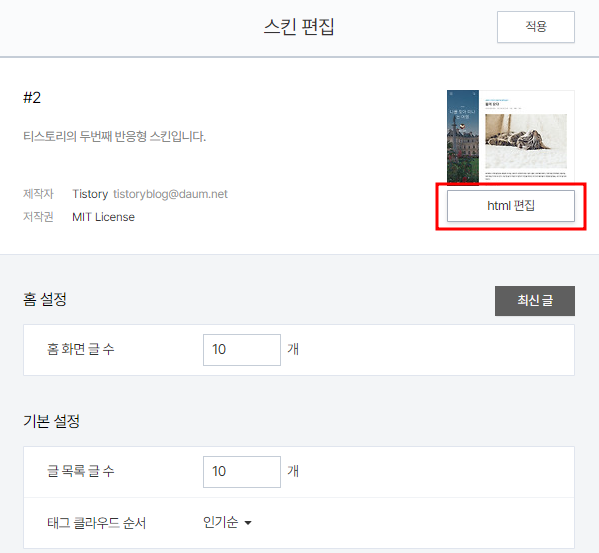 블로그 설정 → 꾸미기 → 스킨 편집 → html 편집 → 파일업로드에 +추가 버튼 눌러서 js 파일 2개 추가