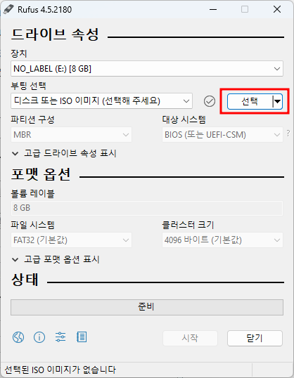 USB를 먼저 꽂아서 검사하고 문제 없음 확인 후 Rufus를 실행히켜서 ISO 이미지 선택을 누릅니다.