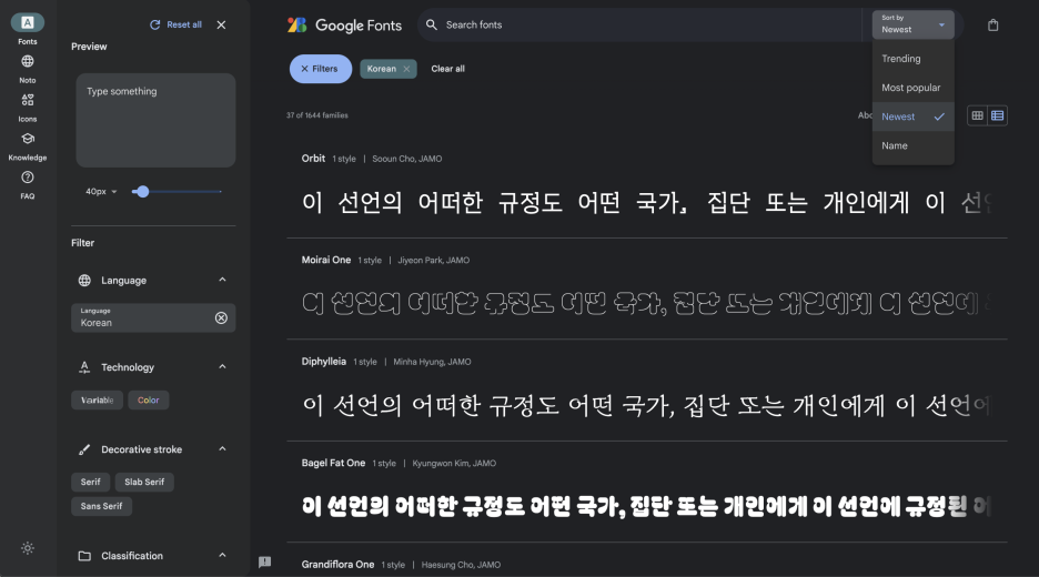 한국어 필터링을 씌우면 한글 지원 폰트도 와르르!