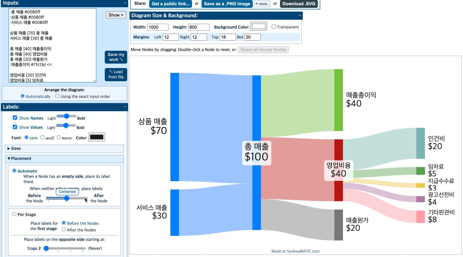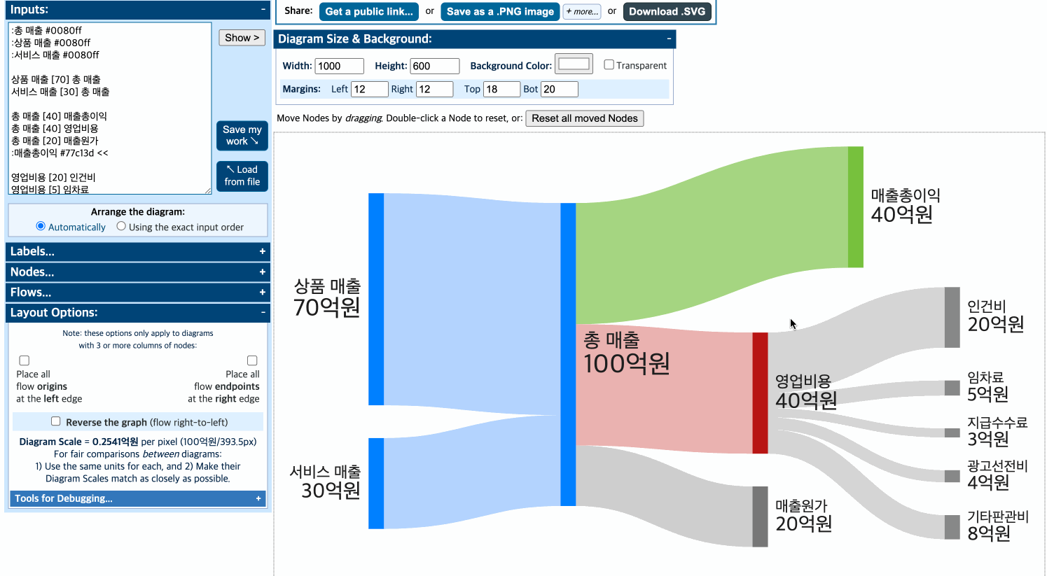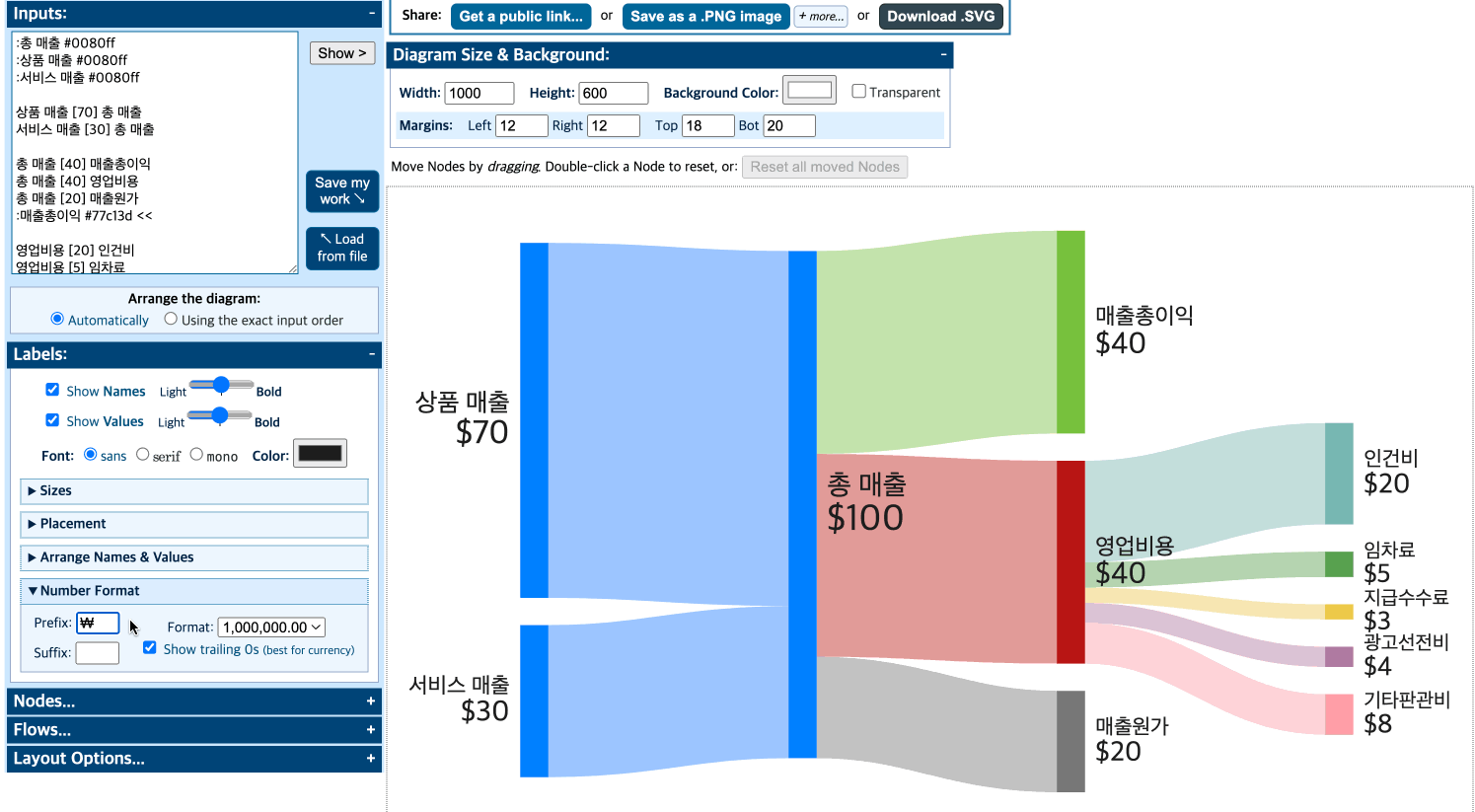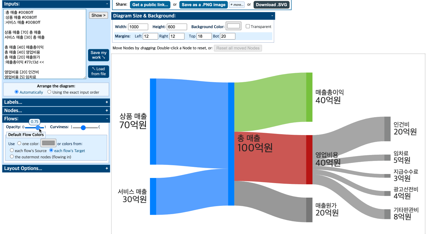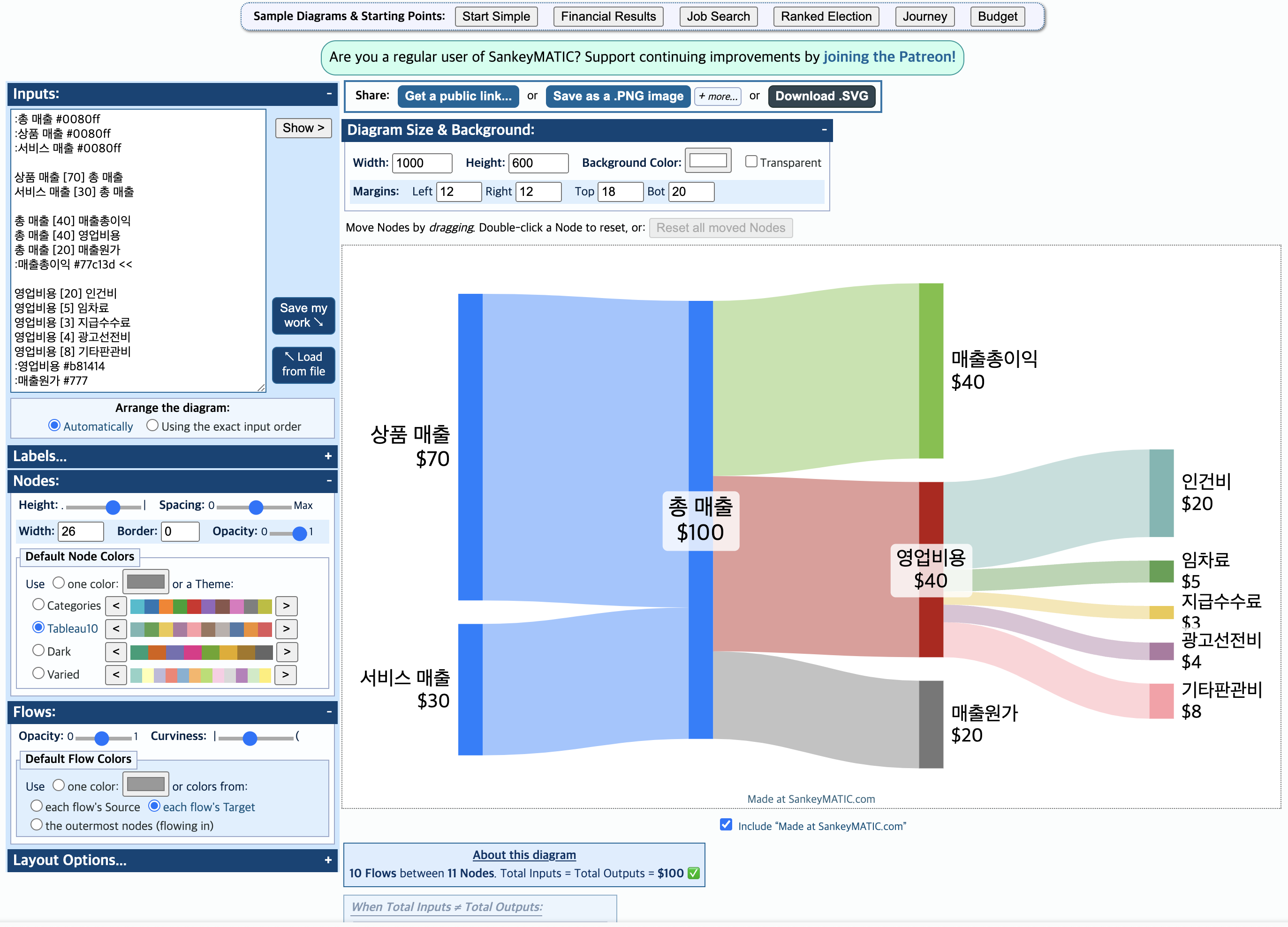 오늘은 무료 온라인 툴 생키매틱 SankeyMatic을 사용해서 이 다이어그램을 직접 만들어볼게요!