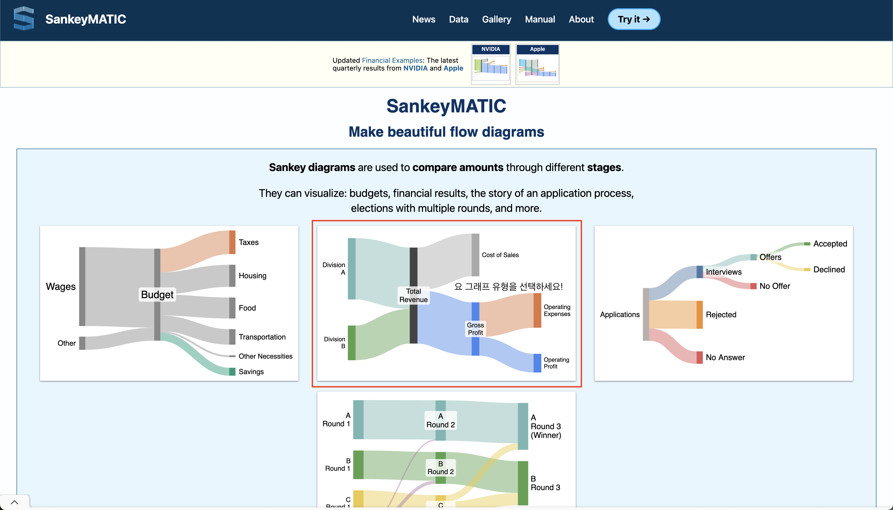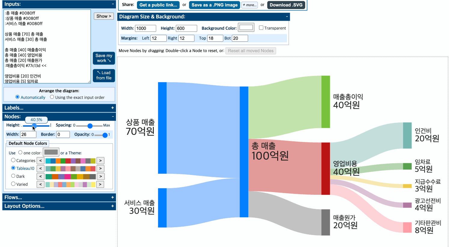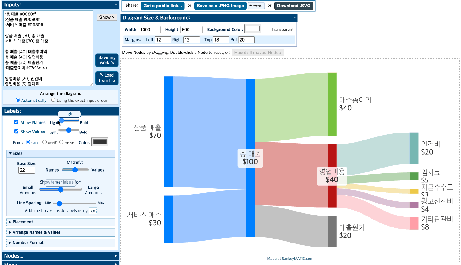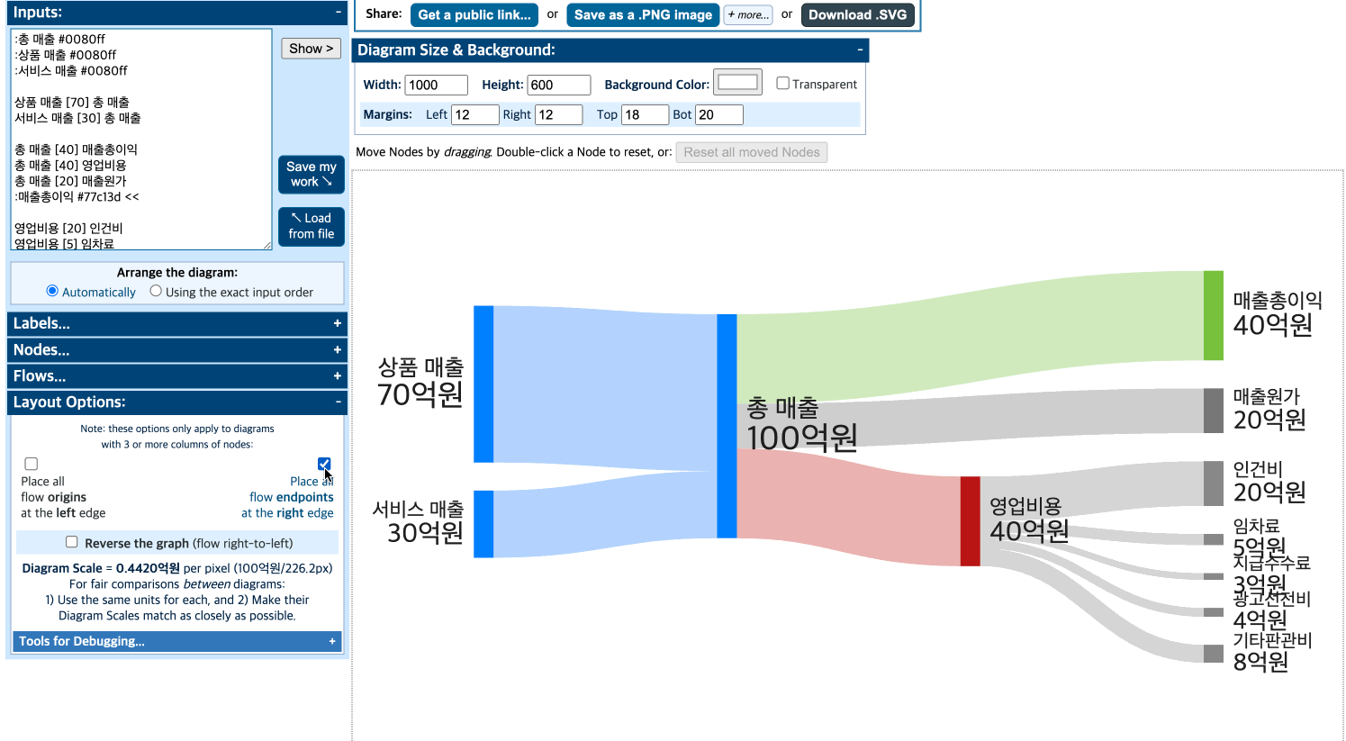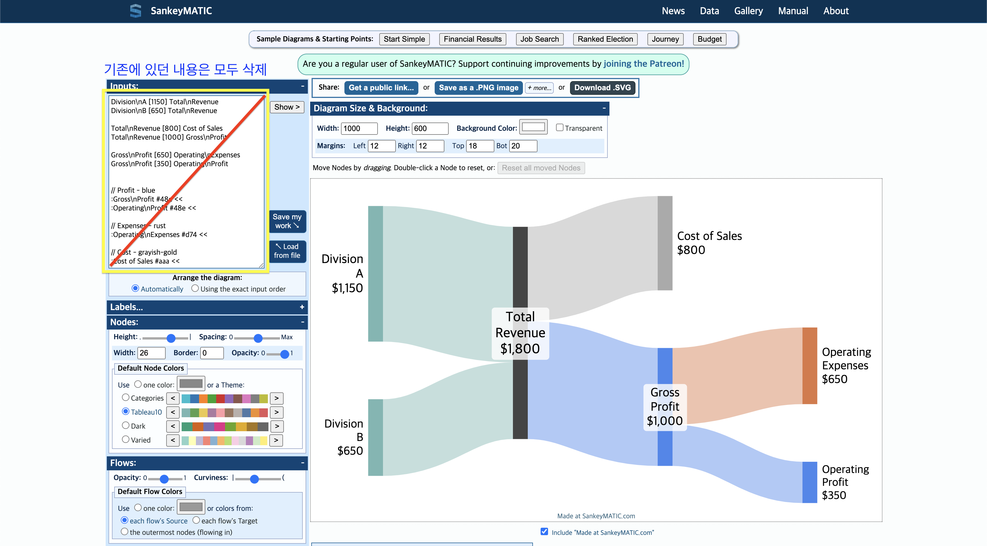 오늘은 무료 온라인 툴 생키매틱 SankeyMatic을 사용해서 이 다이어그램을 직접 만들어볼게요!