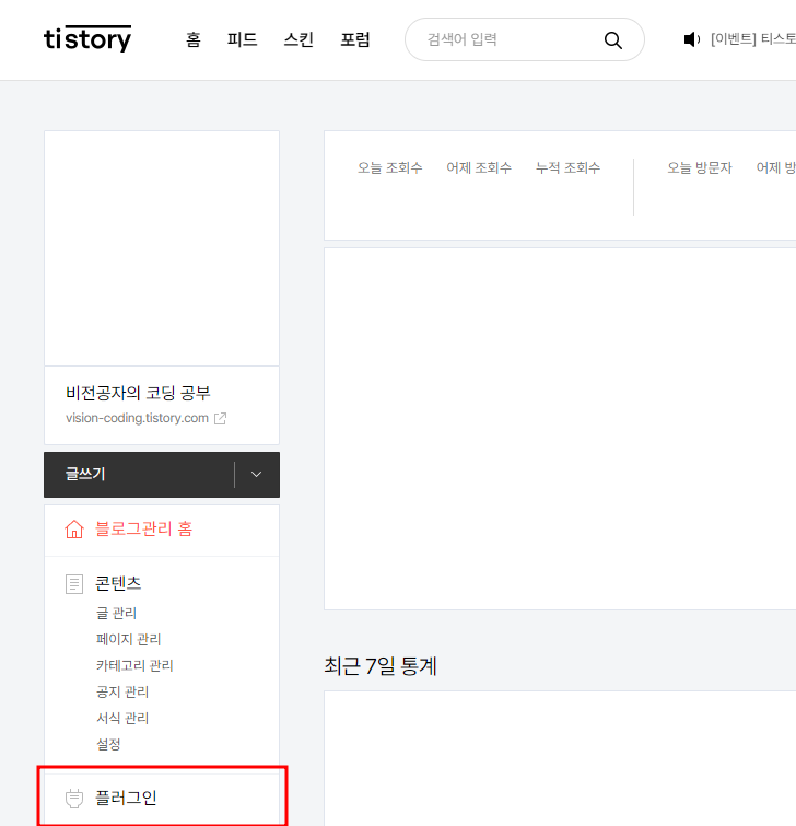 티스토리 관리 창에서 플러그인 메뉴 선택