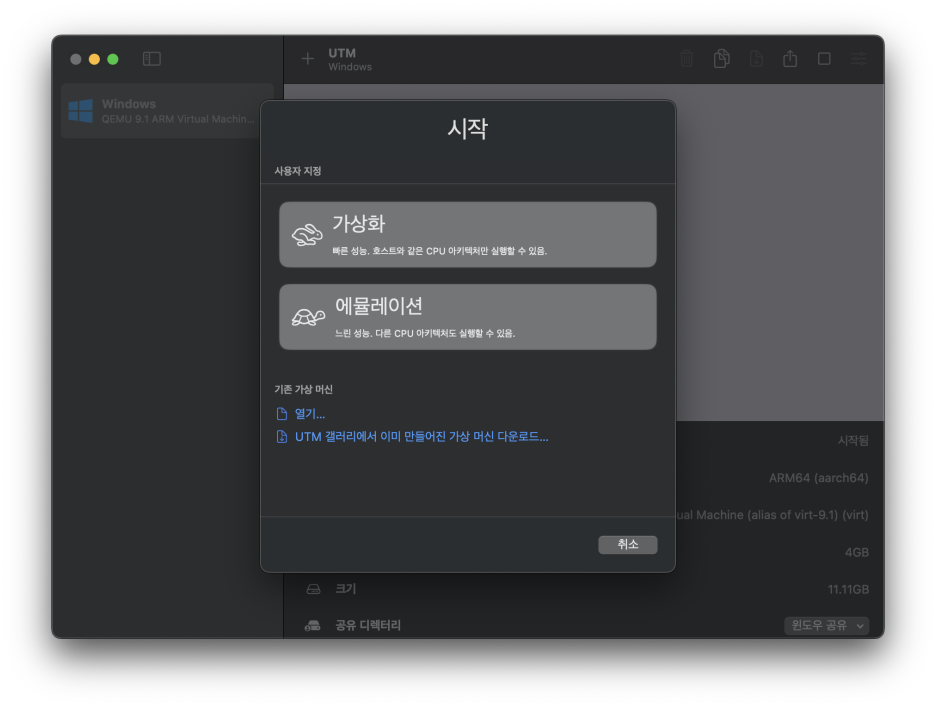 설치가 되고 창이 열리면, 가상화 선택