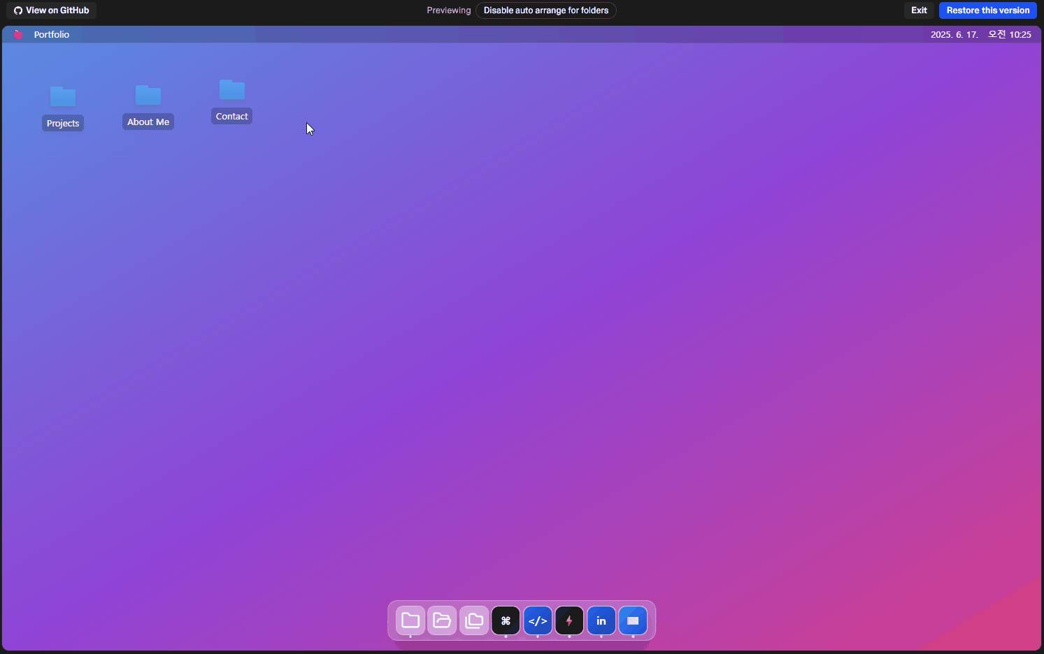 make landing page for my portfolio. design as macbook main page. make dock and finders too. use the interactive motion such as dock icon change while hovering. make the exact same design as macbook main page. I want to click on and drag (also make them move freely, without any grids). click once, open folder. mouse held down and drag, move folder.